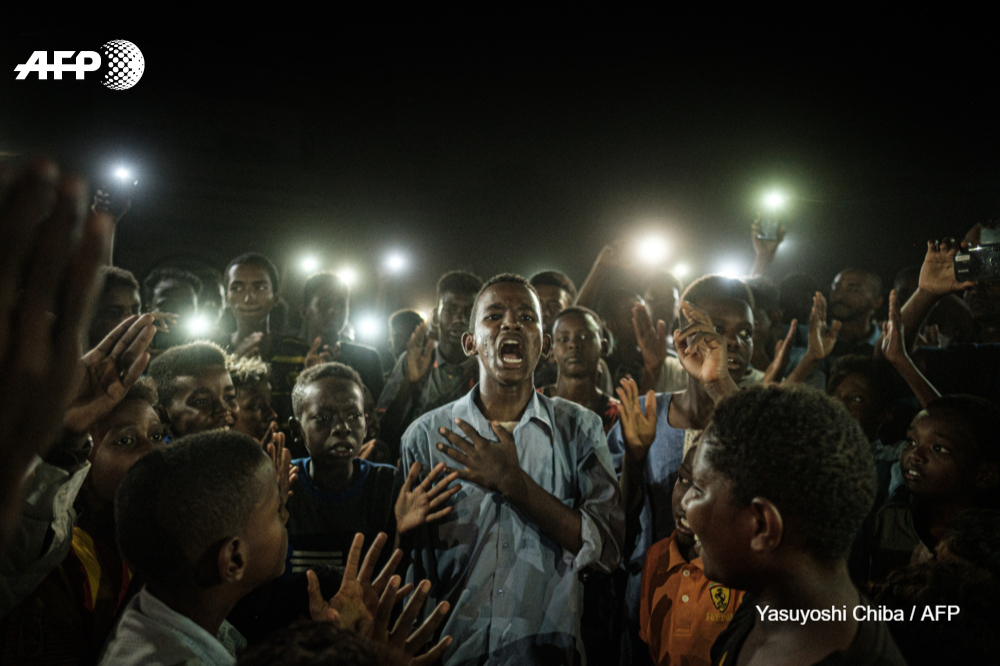 Yasuyoshi Chiba’s “Straight Voice”, voted best photo of the year by the World Press Photo jury, shows a man illuminated by the light of mobile phones, reciting a poem in the middle of a group of protesters demanding a civilian regime in Khartoum, in Sudan.