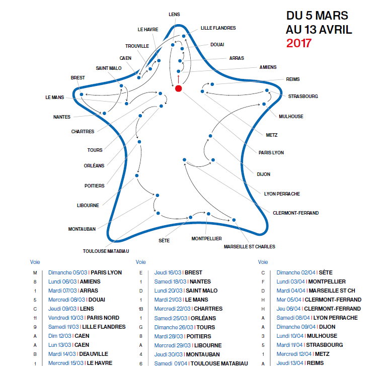 Initié par France Télévisions, Radio France, France Médias Monde, l’INA, le Groupe Randstad France et la SNCF, et avec le soutien de la Documentation française et de l'AFP, le Train de la Présidentielle 2017 se rendra à la rencontre des citoyens en parcourant 31 villes de France.