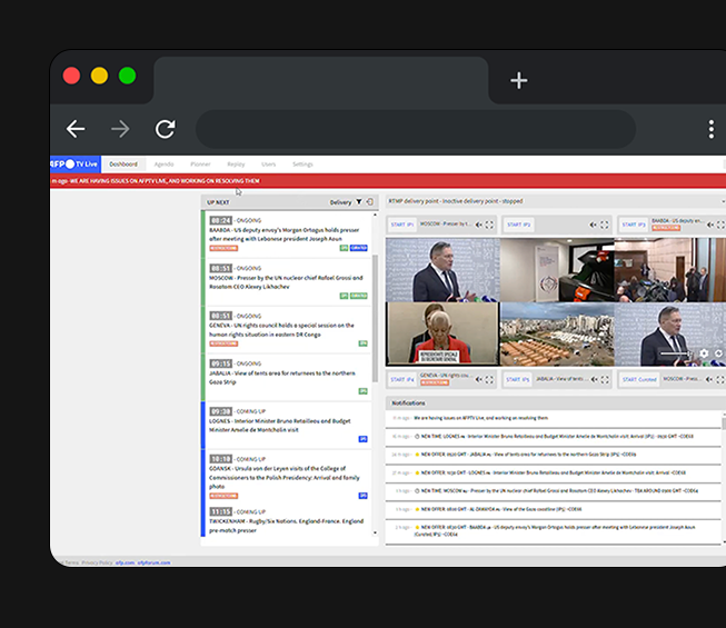 - Accédez à l'agenda d'AFPTV Live, constamment mis à jour, et échangez en direct avec notre équipe.